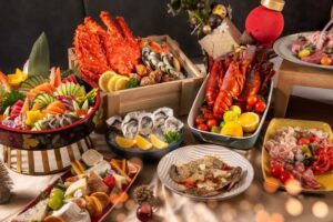 Delight in a gourmet Italian buffet featuring appetizers, seafood on ice, freshly made pasta and pizza, grilled specialties, carving station, soups, and classic Italian main dishes.