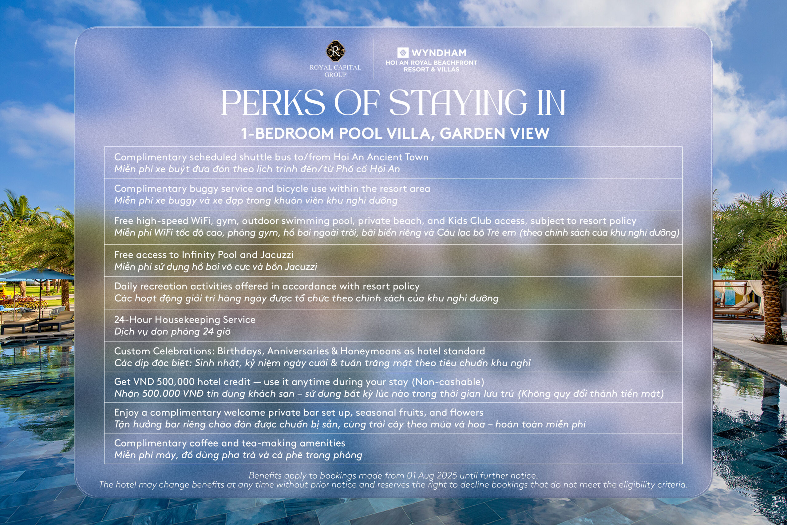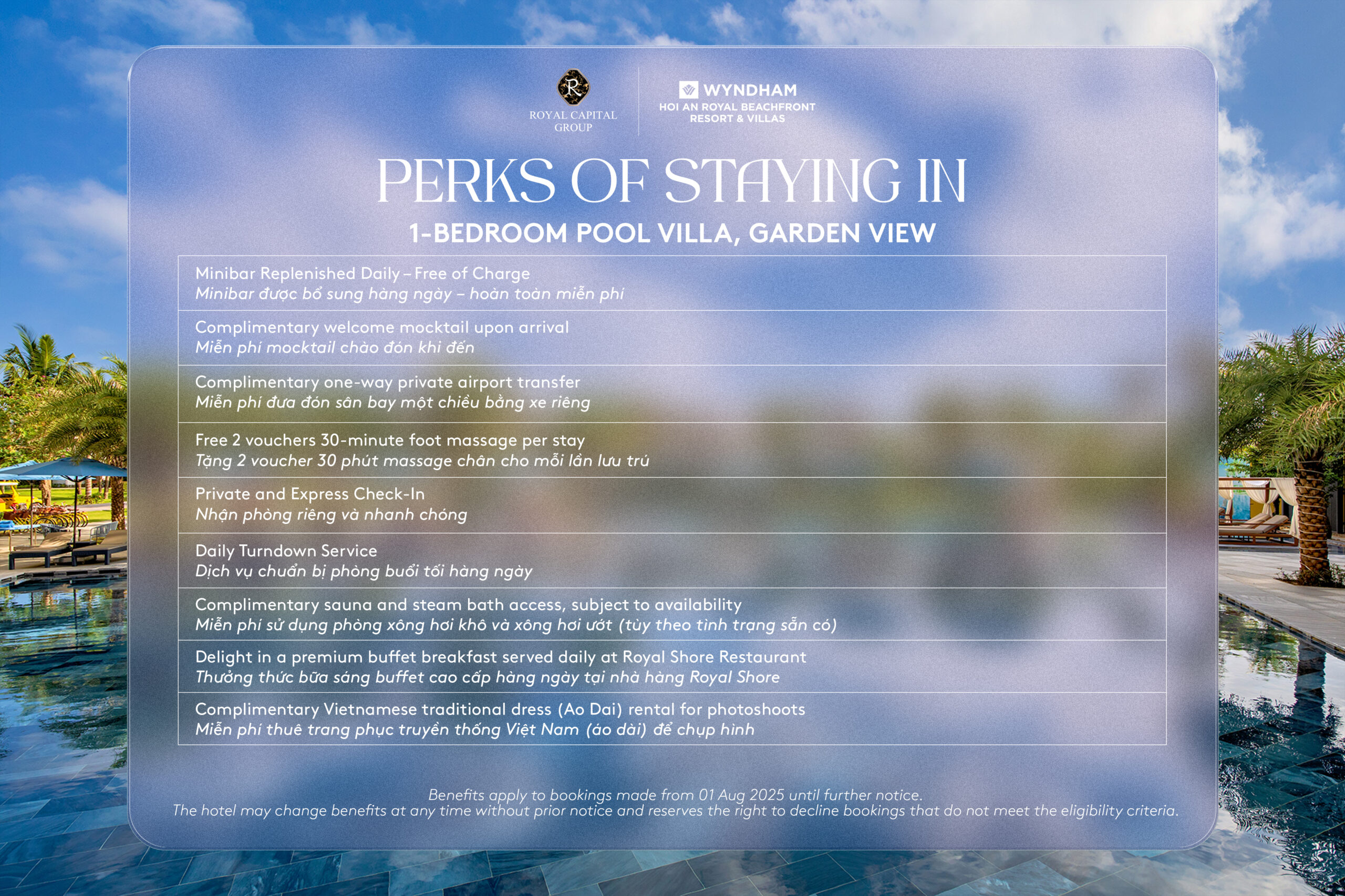 *Quyền lợi được áp dụng cho các đặt phòng từ ngày 01/08/2025 cho đến khi có thông báo mới. Khách sạn có quyền thay đổi các quyền lợi này bất kỳ lúc nào mà không cần báo trước, đồng thời có quyền từ chối những đặt phòng không đáp ứng đủ điều kiện áp dụng.